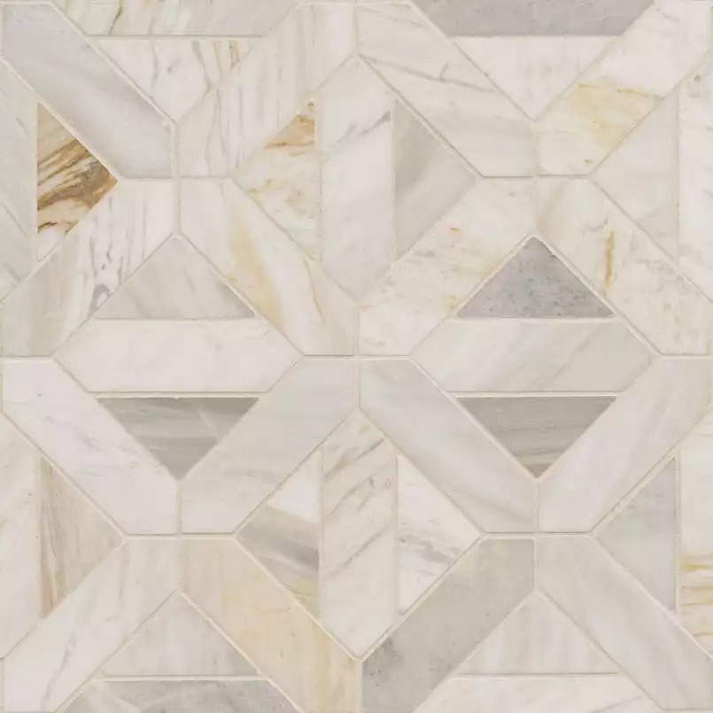 Clean and modern, Athena Gold Geometrica Tile features an array of geometric shapes highlighted by warm white and soft grey hues with subtle veining throughout. Made from marble with a honed finish, the tile adds style to any interior space. The mosaic tile has a mesh backing for ease of installation. Create the space of your dreams by using Athena Gold Geometrica as a kitchen backsplash, on a bathroom or shower wall, as a fireplace surround, on a countertop, and so much more.