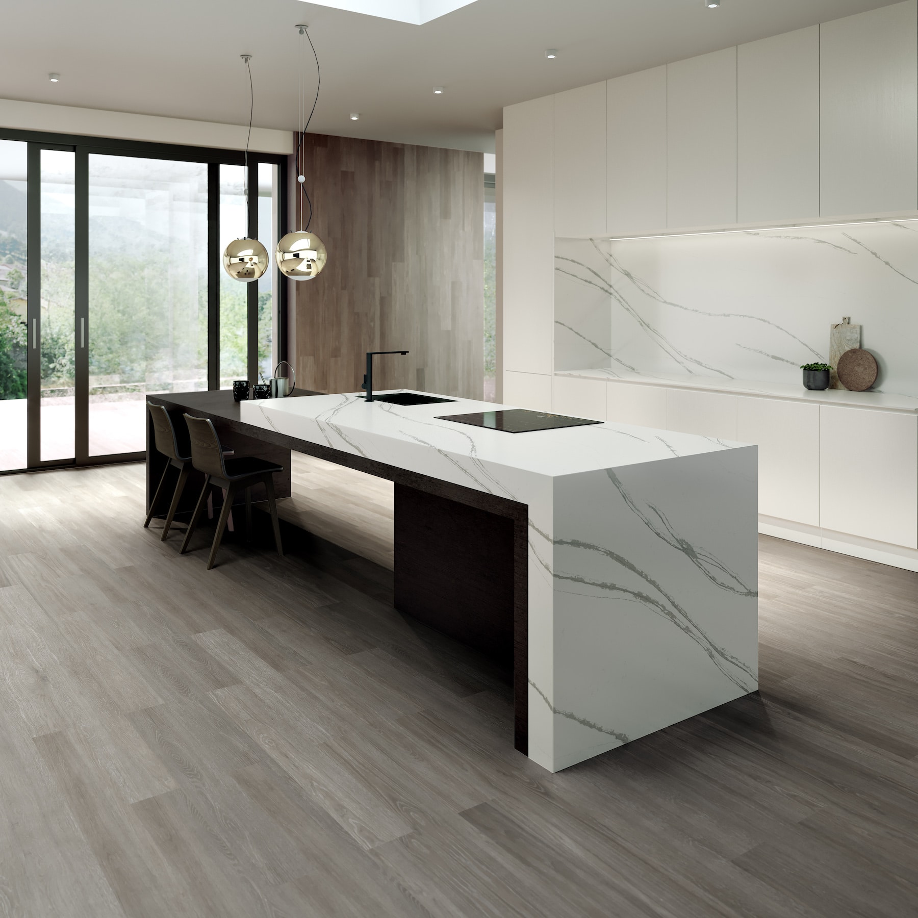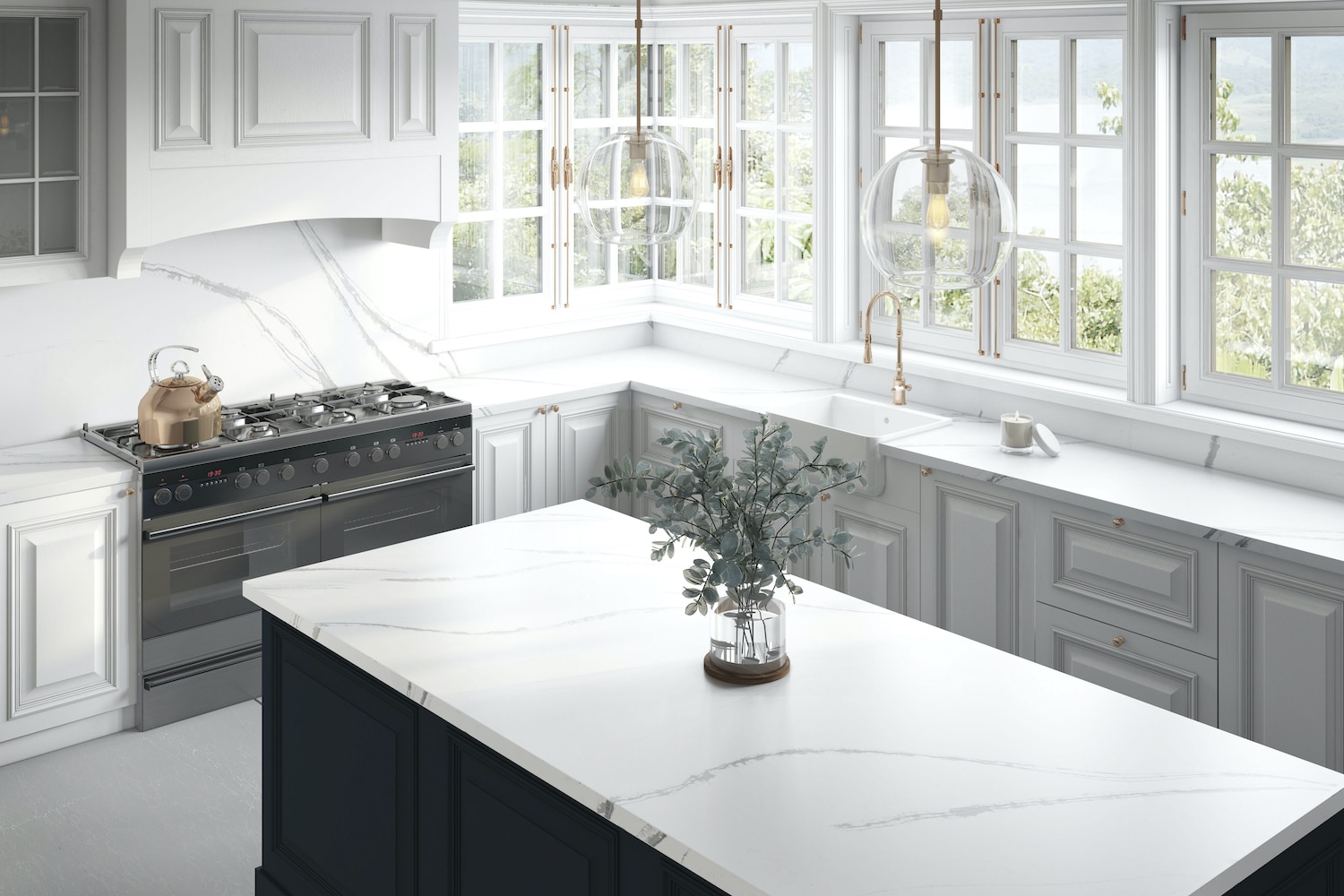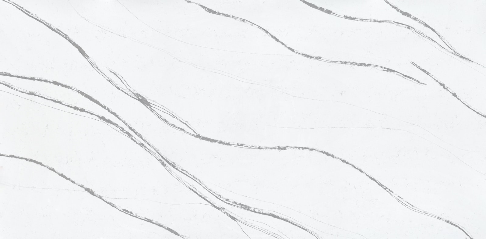 The gorgeous Et Bella is a bright white quartz complete with stunning and striking veins of gray. The stone features a mix of fine to medium-dark gray veins that move in waves throughout the stone, and speckles of light gray against the white.