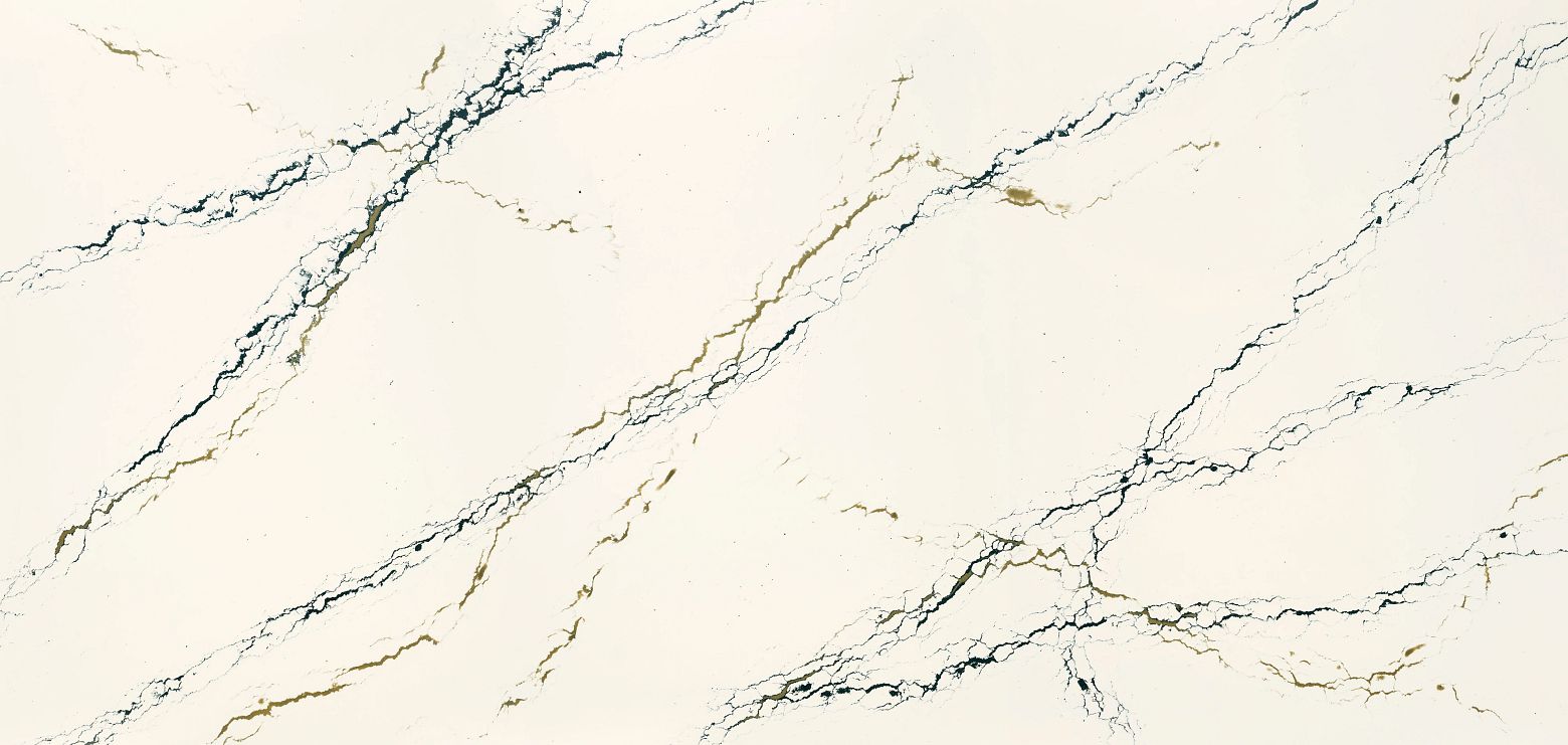 High-contrast, deep-black veins are juxtaposed with understated gold veins on a pristine, cool white canvas. Both the black and gold shimmer with light. Softer capillaries, gradated from the dominant ones, add delicacy.