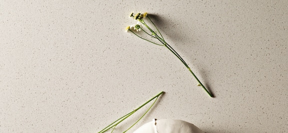 A true white base, blending-in some translucent crystalline particles that sparkle alongside soft specks of grey.
