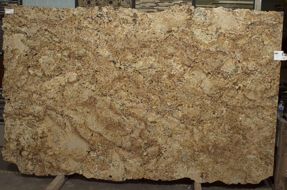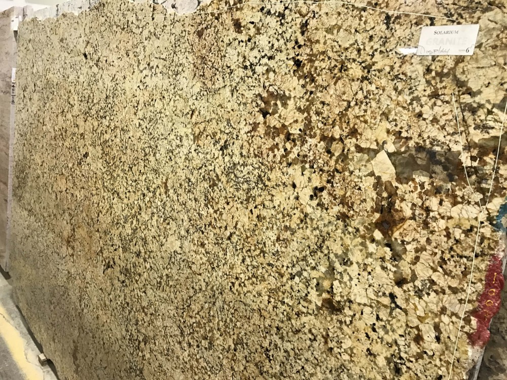 Solarium Granite is also known as Solaris granite which comes from Brazil. It features a gold and creamy beige background with darker veins of brown and gray plus flecks of black crystals. This durable slab polished granite is recommended for commercial and residential properties including landscaping and flooring in climates with freezing temperatures and all indoor applications.